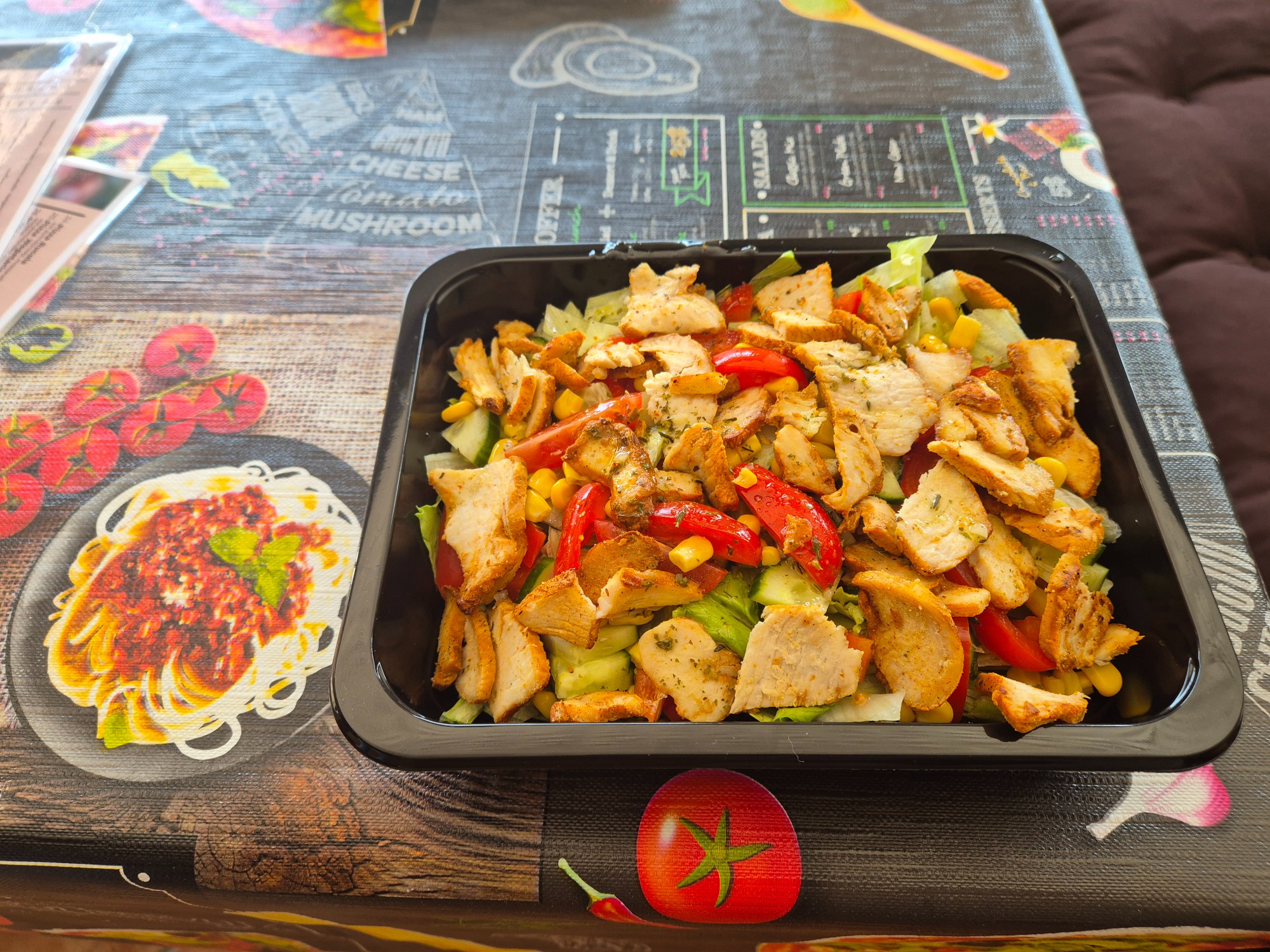 sałata, ogórek, pomidor koktajlowy, papryka, kukurydza, kurczak, sos -